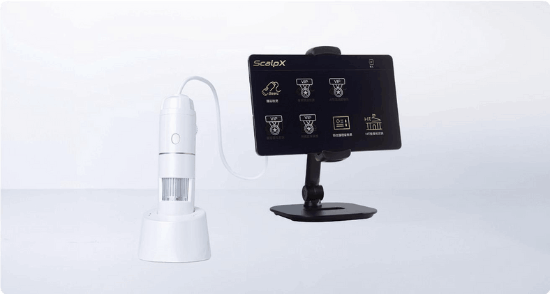 Kết nối thiết bị với máy tính bảng và khởi chạy ứng dụng “ScalpX Scalp Analysis System_AI Version” để bắt đầu sử dụng hệ thống.